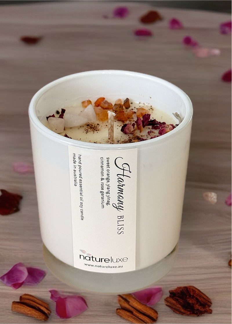 Indulge in tranquility with our ‘Harmony Bliss’ Essential Oil Candle. This curated blend of Sweet Orange, Ylang Ylang, Rose Geranium, and Cinnamon essential oils, enhanced by Pink Rose Quartz and Clear Quartz crystals, creates a harmonious fusion that brings balance to the senses and instills enduring peace. Rose Quartz radiates unconditional love, enhancing compassion, while Clear Quartz, the “master healer,” amplifies the therapeutic journey. Illuminate your space with the radiant glow of Harmony, fostering serenity and unity.